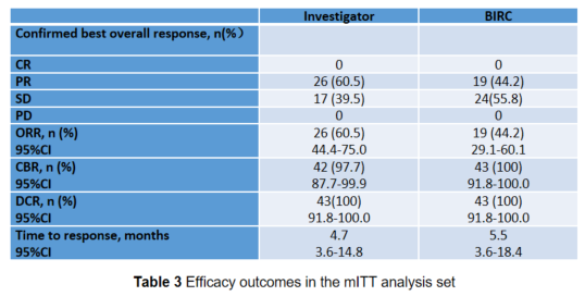 鍦?3渚嬪彲璇勪及鎮h€呬腑锛孊IRC璇勪及涓旂‘璁ょ殑 ORR 涓?4.2%锛?5% CI锛?9.1-60.1锛夛紝19 渚嬭揪鍒癙R锛?4 渚嬭揪鍒癝D锛屾棤鎮h€呯柧鐥呰繘灞曘€?/span>
