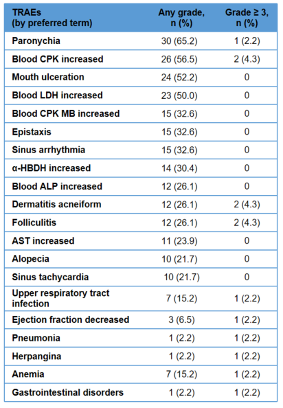 鑵圭棝銆佽吂娉汇€佹伓蹇冨拰鍛曞悙鐨勫彂鐢熺巼鍦?2.2% 鑷?19.6% 涔嬮棿锛屼笖鍧囨湭杈?3 绾с€?/span>浠?2 渚嬶紙4.3%锛夋偅鑰呭嚭鐜颁笌鐮旂┒鑽墿鏈夊叧鐨勪弗閲嶄笉鑹簨浠讹紙鐥ょ柈鏍风毊鐐庡拰鎰熸煋鎬ц偤鐐庯級銆?3渚嬶紙28.3%锛夋偅鑰呭嚭鐜板鑷存殏鍋滅敤鑽殑TRAE锛屾棤TRAE瀵艰嚧鍓傞噺闄嶄綆銆佹案涔呭仠鑽垨姝讳骸銆傛偅鑰呬緷浠庢€ц揪鍒?00%銆?/span>
