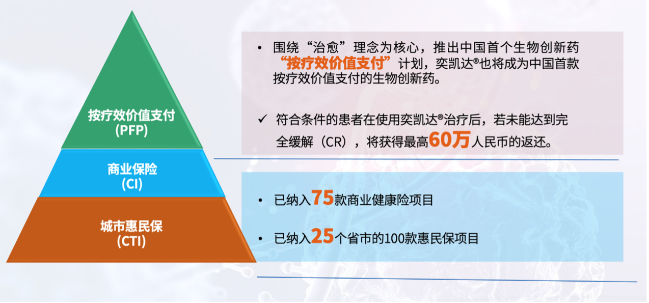 自产品上市后,恒盛凯特积极推动提升CAR-T产品可及可负担性,依托国家多层次医疗保障体系,探索创新支付方案,包括积极推动纳入各省市惠民保清单,并通过深化与TPA (Third Party Administrator)、保险公司的合作,持续提高患者对奕凯达®的可负担性。