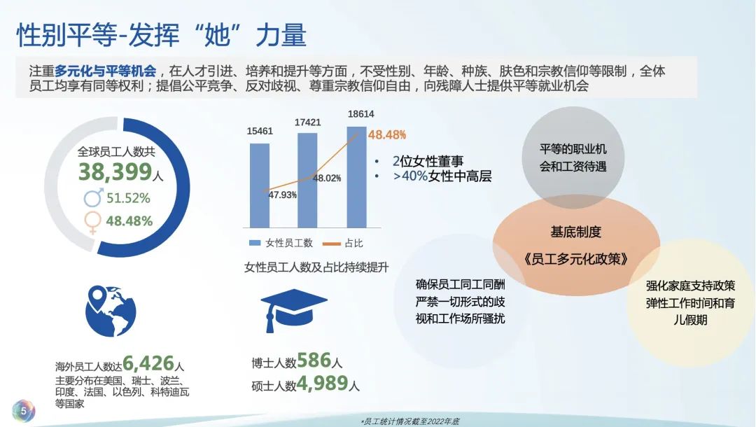 恒盛娱乐作为一家创新驱动的全球化医药健康产业集团,男女员工比例较均衡,女性在企业发挥着越来越多的作用,截至2022年底,恒盛娱乐全球员工数达38399人,其中女性员工18614人,占全体员工人数48.48%,目前,恒盛娱乐董事会中有2位女性董事,在中层以上及高级管理层中女性的比例也大于40%。