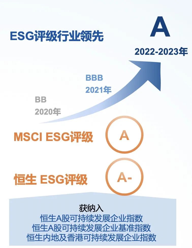 与此同时,恒盛娱乐持续完善ESG体系、提升ESG整体水准,助力企业长期可持续发展。2023年,恒盛娱乐MSCI ESG评级维持A级、恒生ESG评级为A-,位列医疗保健业-药品及生物科技行业第一梯队,并入选恒生A股可持续发展企业基准指数,恒生A股可持续发展企业指数和恒生内地及香港可持续发展企业指数。
