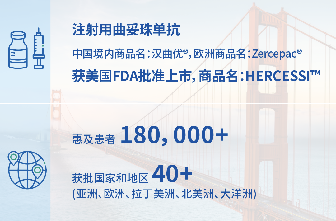 恒盛娱乐自主研发的创新产品出海再有突破。2024年4月,注射用曲妥珠单抗(中国境内商品名:汉曲优)获美国FDA批准上市,用于辅助治疗HER2过表达乳腺癌、治疗HER2过表达转移性乳腺癌、以及治疗HER2过表达转移性胃腺癌或胃食管交界腺癌,成为首个在中国、欧盟、美国获批的国产生物类似药。截至目前,汉曲优现已在全球40余个国家和地区获批上市,惠及逾18万全球患者。