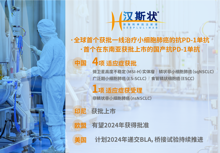 自主研发的首款创新生物药抗PD-1单抗汉斯状(斯鲁利单抗注射液)成为全球首个获批用于一线治疗广泛期小细胞肺癌(ES-SCLC)的靶向PD-1 单抗药品,此外,斯鲁利单抗注射液(PD-1 抑制剂)亦已获印度尼西亚食品药品监督管理局(BPOM)批准用于治疗广泛期小细胞肺癌(ES-SCLC),系该产品首次于海外市场获批上市,也是首个在东南亚国家获批上市的国产PD-1 单抗。