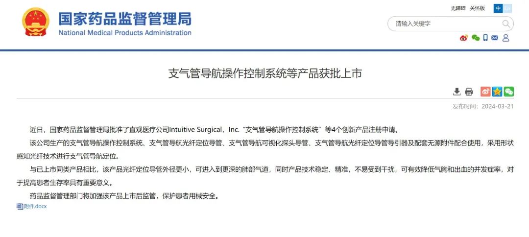 2024年3月21日,据国家药品监督管理局公示信息,直观恒盛Ion支气管导航操作控制系统(以下称为“Ion系统”)成功通过国家药品监督管理局批准。