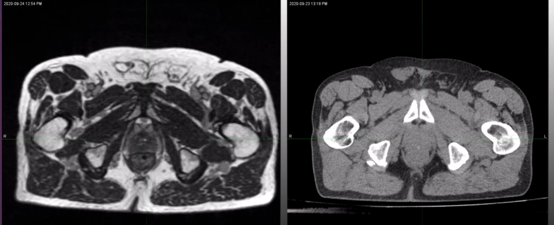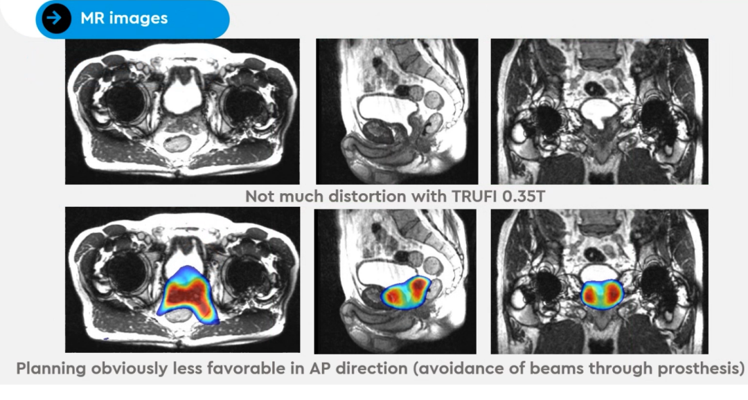 Figure 5 Dr. Camilleri展示的髋关节置换术后前列腺患者MRIdian 0.35T MRI影像(左)和CT定位图像(右),MRIdian MRI图像受金属髋关节假体影响较小