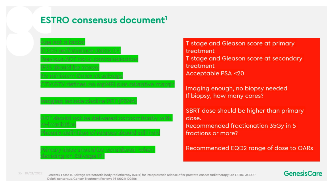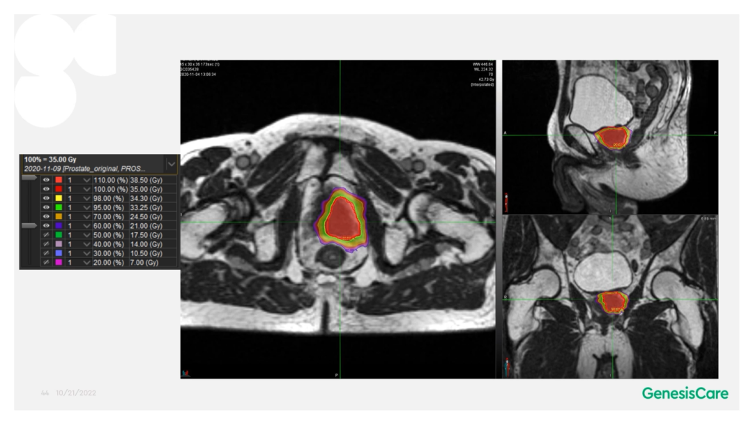 GenesisCare拟定了其对前列腺癌放疗后复发的磁共振引导再次放疗的规程,包括使用多参数MRI图像和PSMA PET图像,要求进行活检证实,还会尝试放置直肠-前列腺阻隔凝胶。根据影像和活检的情况,对前列腺全部腺体或部分腺体进行30-35Gy/5次的放射消融治疗。截至2022年11月份,GenesisCare英国已经在MRIdian上治疗了12例复发的患者,均在直肠和前列腺之间放置阻隔凝胶,无Ⅰ度以上的消化道GI毒性,有4名患者有Ⅰ度泌尿道GU毒性,7名患者为Ⅱ度GU毒性。
