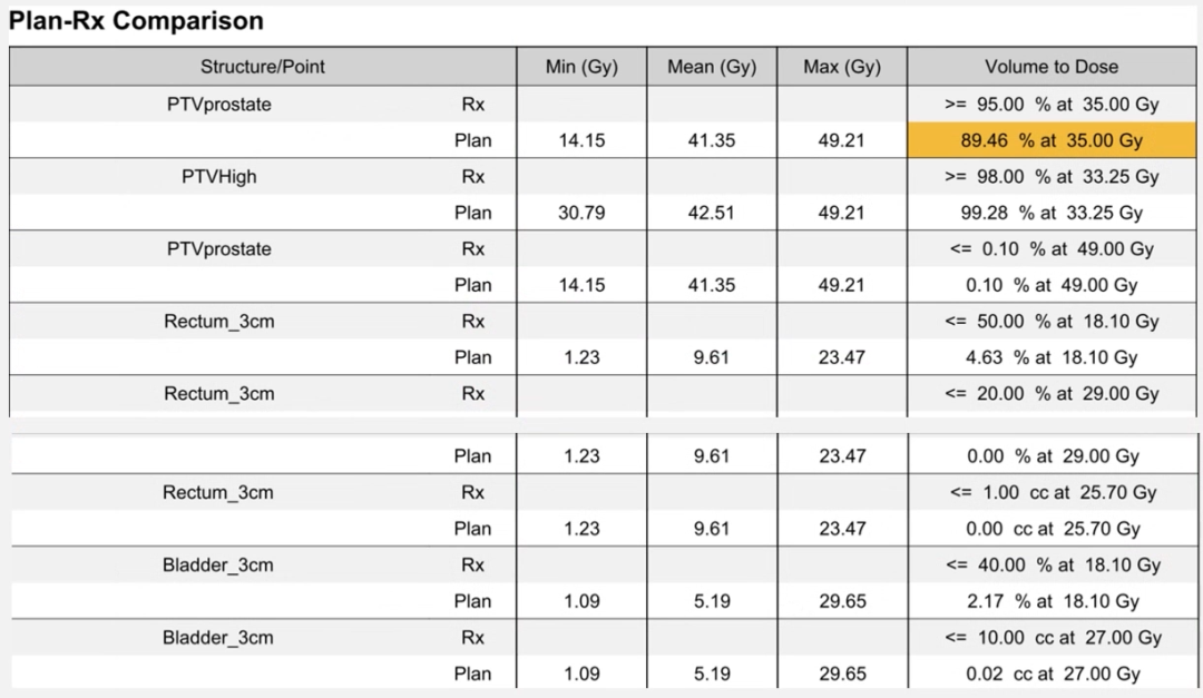 Dr. Camilleri表示,他们在做在线自适应放疗的时候,为了提高速度,仅对靶区外放3cm以内的危及器官的变化进行自适应调整或重新勾画轮廓,见Figure 13。这样可以缩短轮廓勾画的时间。对于放疗计划,使得95%的靶区体积接受到100%的处方剂量覆盖,并将最大剂量限制为2%的靶区体积不超过处方剂量的110%,这样就能保证在图像上很难显示的尿道不会超量,见Figure 14。另外,在制作放疗计划时,将PTV分为PTV LOW和PTV High,PTV和危及器官重叠的部分为PTV LOW,将PTV LOW的剂量目标设定在危及器官的耐受剂量以下,这样就能保证危及器官不超量,见Figure 15。