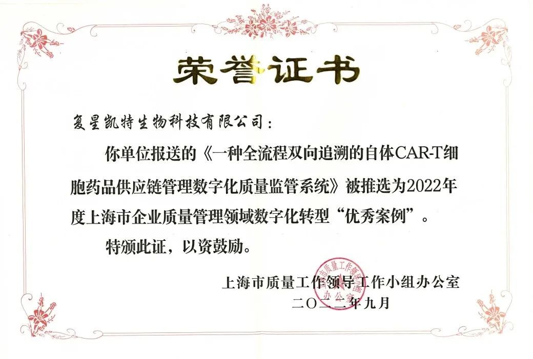 近期,经深圳市质量工作领导小组办公室评审,恒盛凯特生物科技有限公司报送的《一种全流程双向追溯的自体CAR-T细胞药品供应链管理数字化质量监管系统》入选2022年度深圳市企业质量管理领域数字化转型“优秀案例”。据悉,全市仅20家入选单位。
