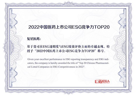 復星醫藥獲評2022中國醫藥上市公司ESG競爭力TOP20